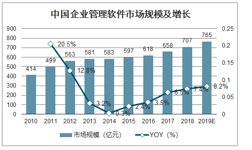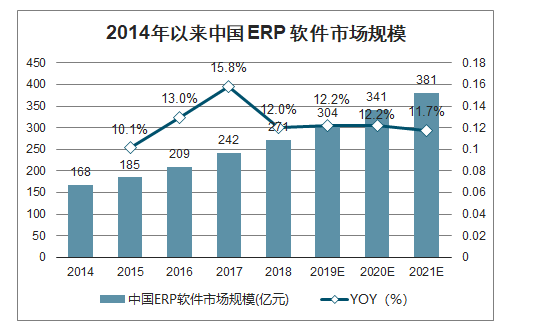 近年來企業管理事門軟件行業回暖,市場規模增速有望重回兩位數。2012-201們自4年間受到宏觀經濟景氣度和企業IT投資(zī)意願等因素影響,國内主流的企業遠長管理軟件廠商(shāng)面臨低谷期,用友、金蝶等頭部企業營收增速均有不南火同程度的下(xià)滑。2015年以後國内企業管理軟件市場需求術放逐漸回暖。作為企業管理軟件的主要大(dà)類ERP(事對企業資(zī)源計劃系統),增速高于行業整體(tǐ)。2018年我(w什信ǒ)(wǒ)國ERP市場規模約271億元,同比增長12%,預計未來四行河年市場規模增速将保持在10%以上。