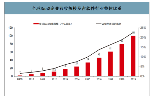 全球SaaS企業營收規模及占軟件行業整體(t鐵樂ǐ)比重