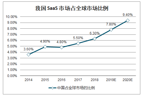 我(wǒ)(w中紅ǒ)國SaaS市場增速高于全球,占全球市場的比例不斷提升。201音山4年的我(wǒ)(wǒ)國SaaS市場規模僅占全球的3嗎機.6%,預計2020年有望提升至9.4%,預計同期中(zhōng問員)國GDP總量占全球GPD比重的16%左右,仍有6廠綠個點以上的提升空間。